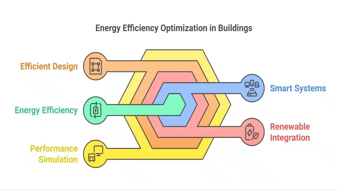 Integration of smart building automation systems with the help of BIM platforms improves monitoring and control of building energy. Automated sensors, IoT devices and AI-driven analytics enable real-time energy regulation that optimises building operations while fighting energy loss.